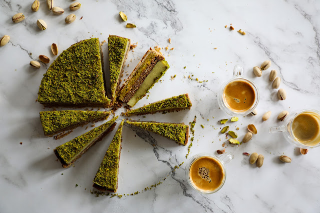 Ето от какво е приготвен този вкусен тарт: ванилова коричка, шамфъстъчен франжипан, хрупкав шамфъстъчен слой, слой кадифен крем с шамфъстък и бял шоколад, плътна поръска от фино смлян шамфъстък. С няколко думи процеса е следния:
