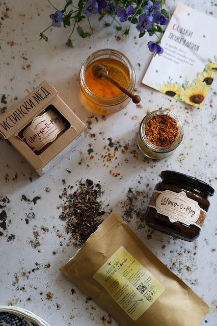 Шоко-о-мед е приготвен от 65% чист пчелен мед букет, 30% лешников тахан и 5% какао